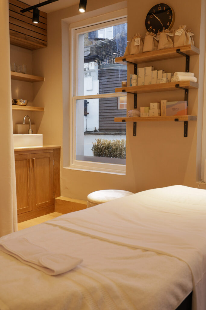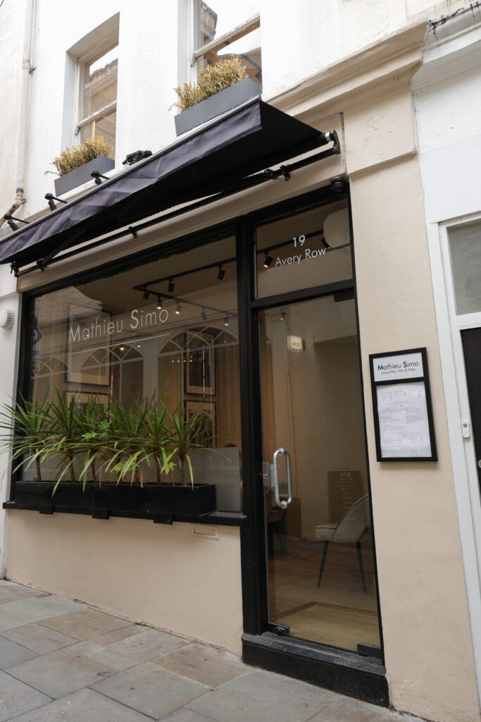 The studio is located in Mayfair, London, providing a quiet space away from the pace of the city where clients can relax and focus on their skin health.